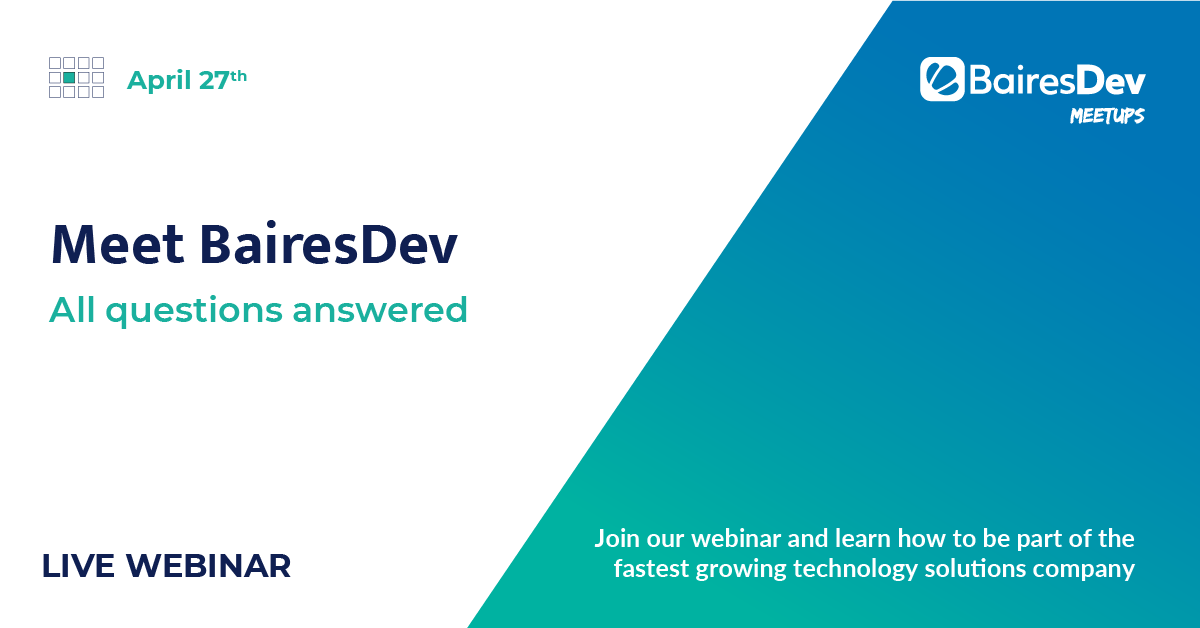 BairesDev is holding a Webinar, an online meeting, where we will talk about the company, what we learned along the way, and be there to answer your questions. We would love to see you there, get to know you better, and take some feedback.